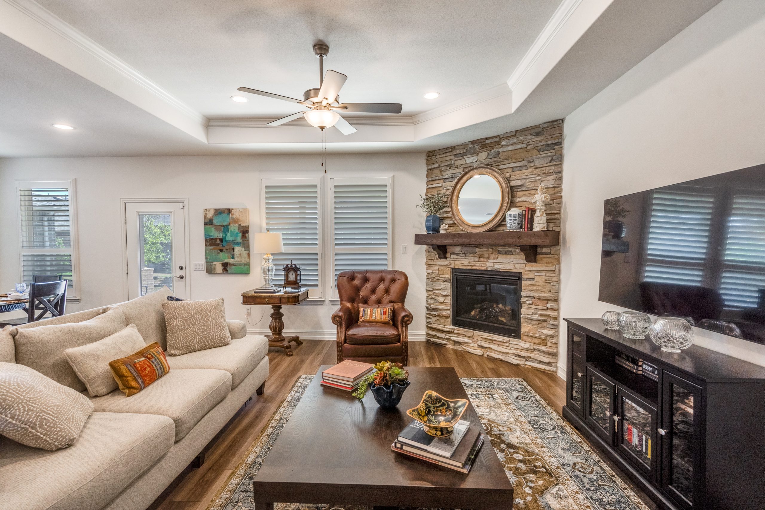 Thoughtfully selected builder upgrades and enhancements throughout make this home stand out from others in the community. A large covered front porch welcomes you into a meticulously maintained interior featuring luxury vinyl plank flooring, crown molding, plantation shutters, and upgraded tray ceilings in both the living room and primary suite.