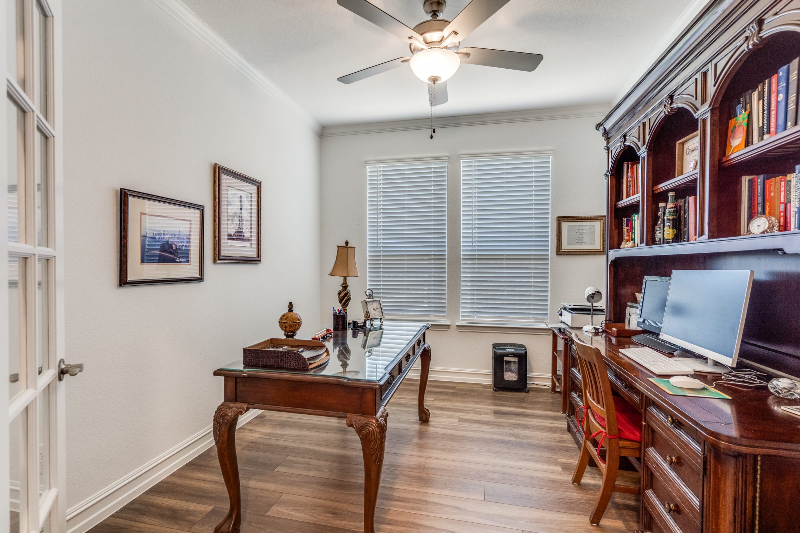 The fantastic split-bedroom layout offers privacy for guests, with a spacious secondary bedroom and a beautifully upgraded full bath featuring a walk-in shower (no tub), plus a private study with French doors—ideal for a home office or flex space.