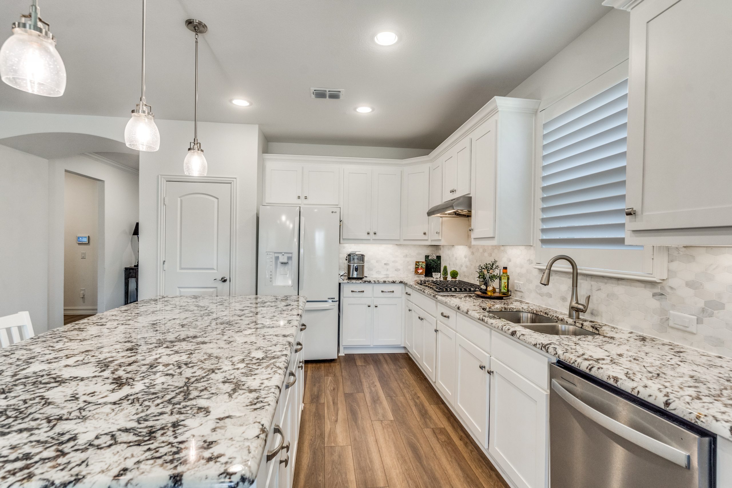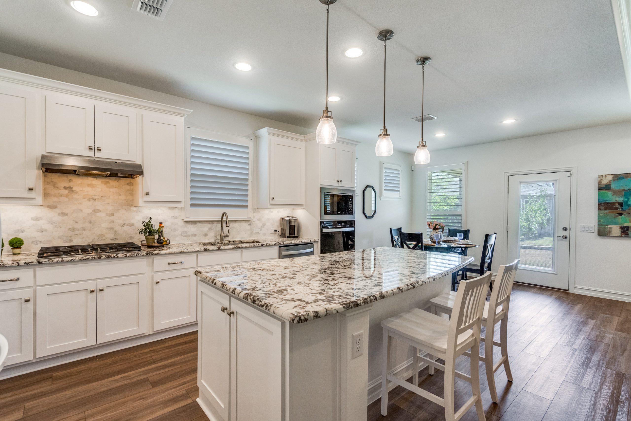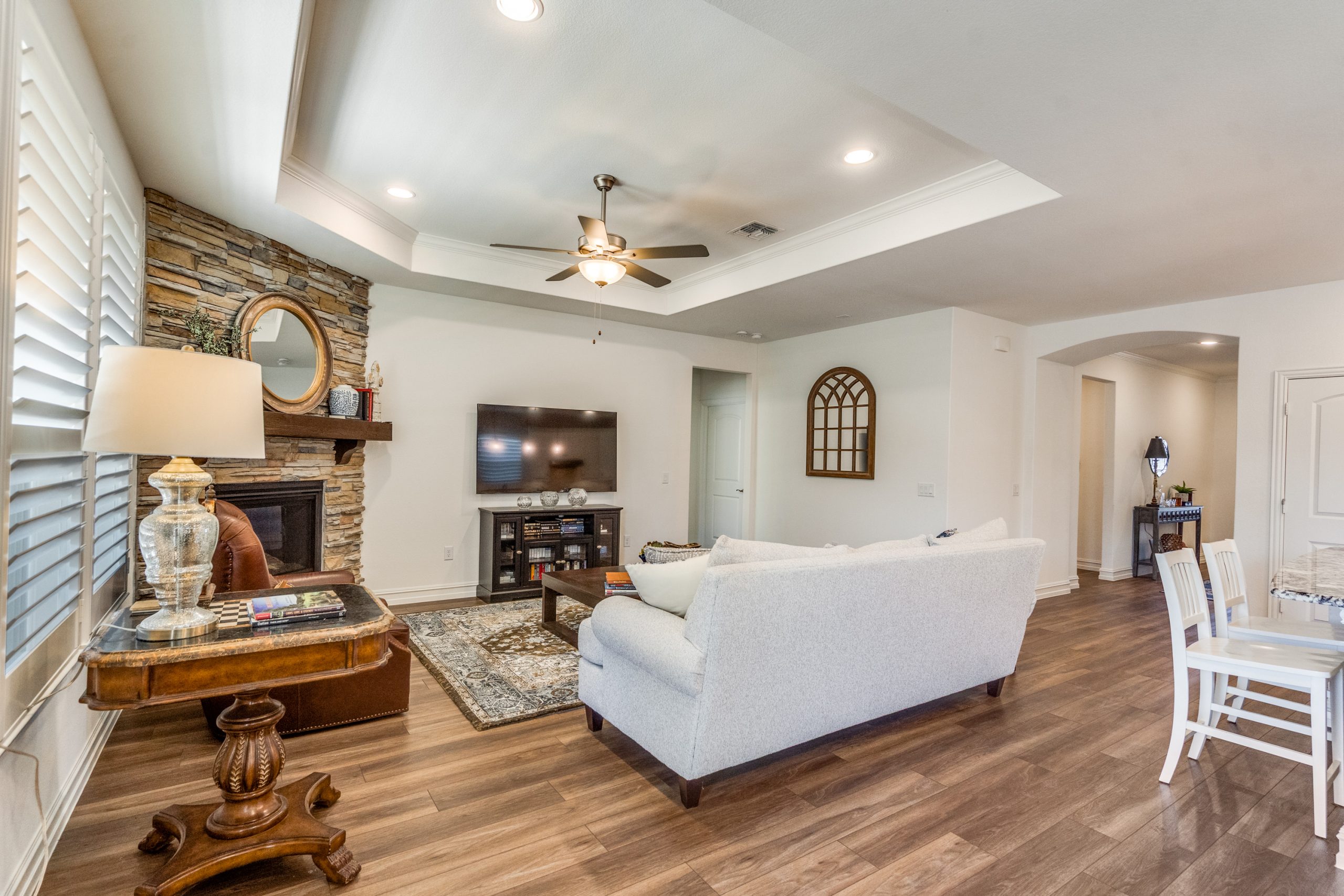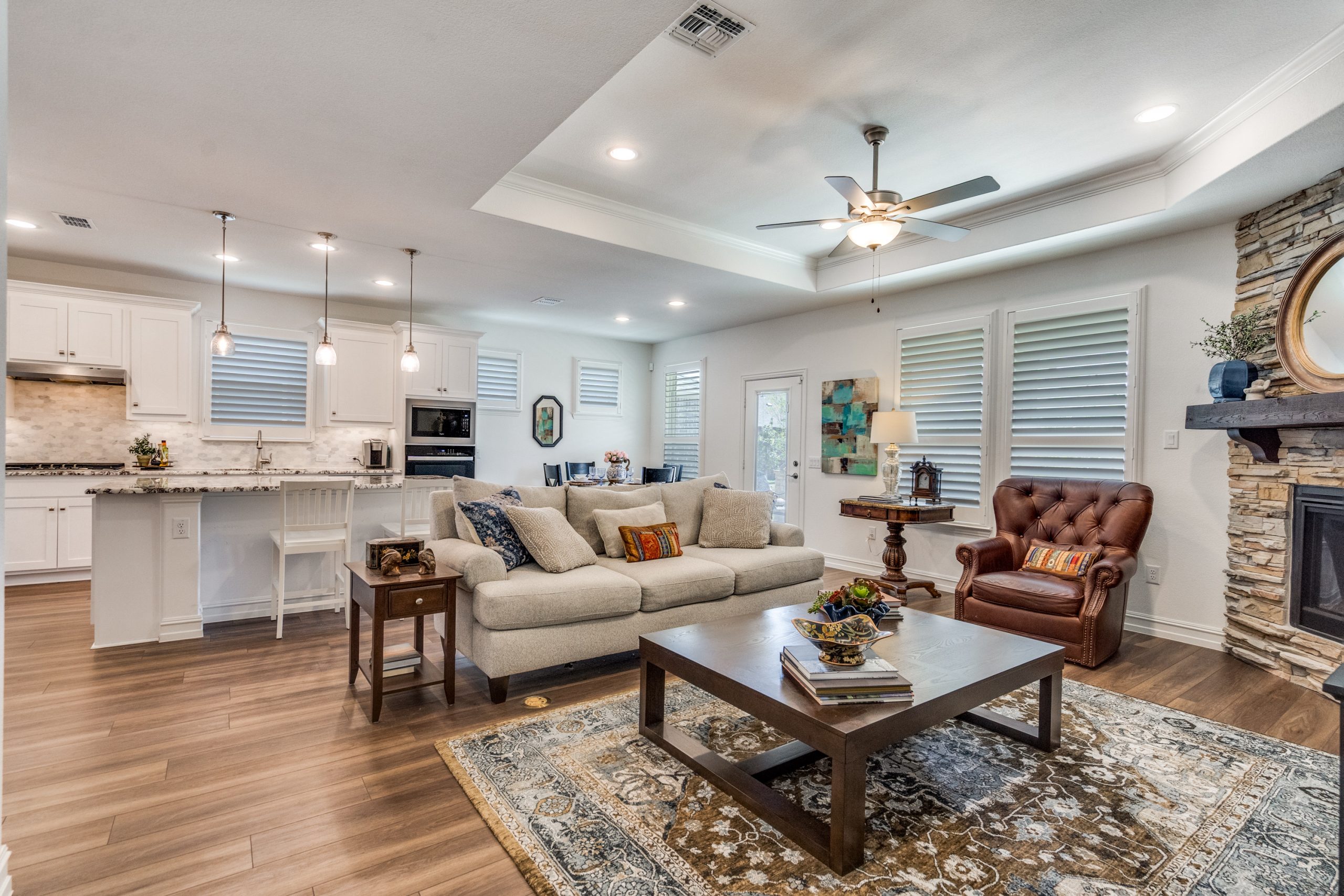 The open-concept living room showcases a striking stone fireplace—an uncommon and highly desirable feature in this floor plan—creating a warm and inviting focal point. The space flows seamlessly into the chef’s kitchen, complete with granite countertops, a large island with breakfast bar seating, ample cabinetry, generous counter space, and a dedicated dining area—perfect for everyday living and entertaining.