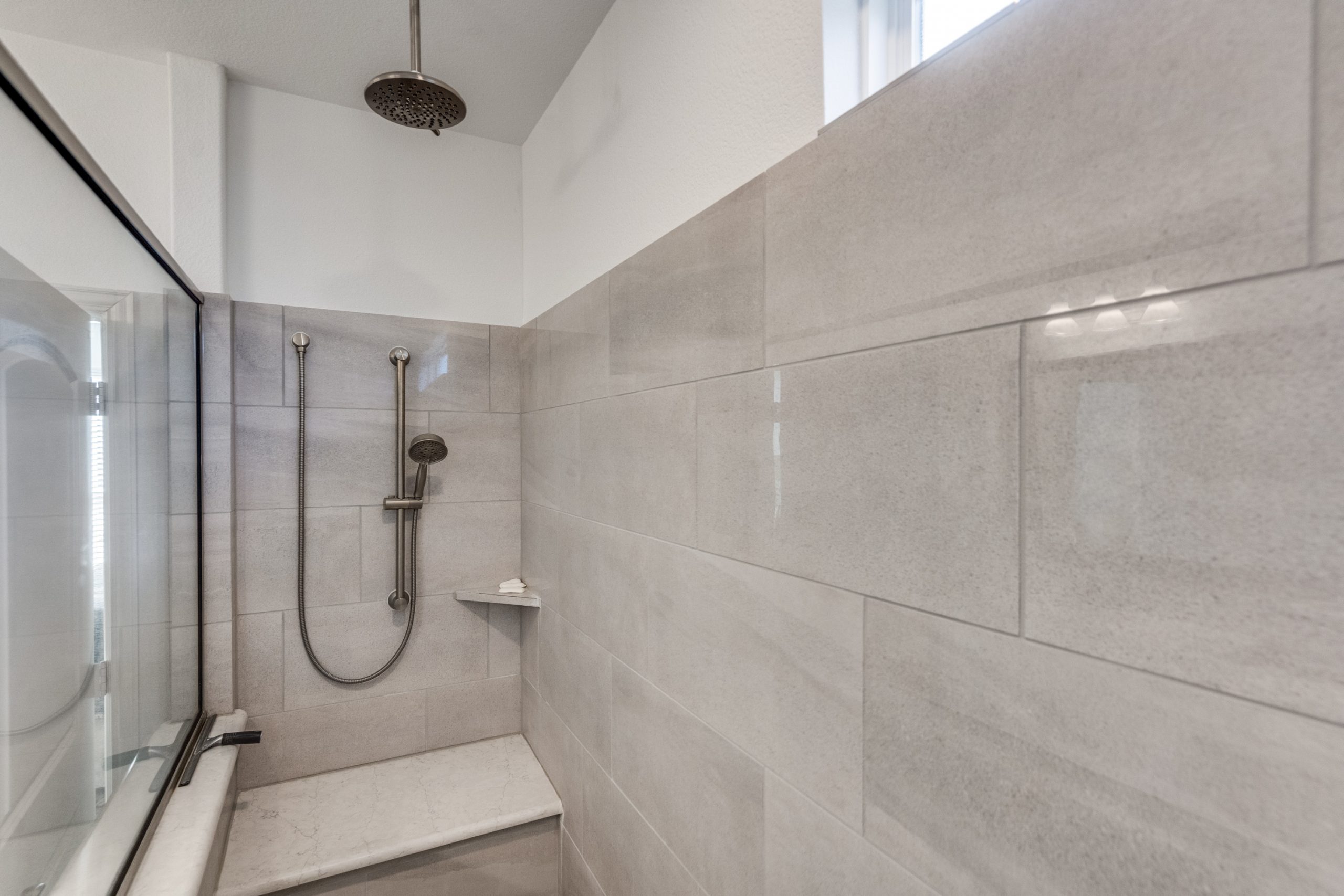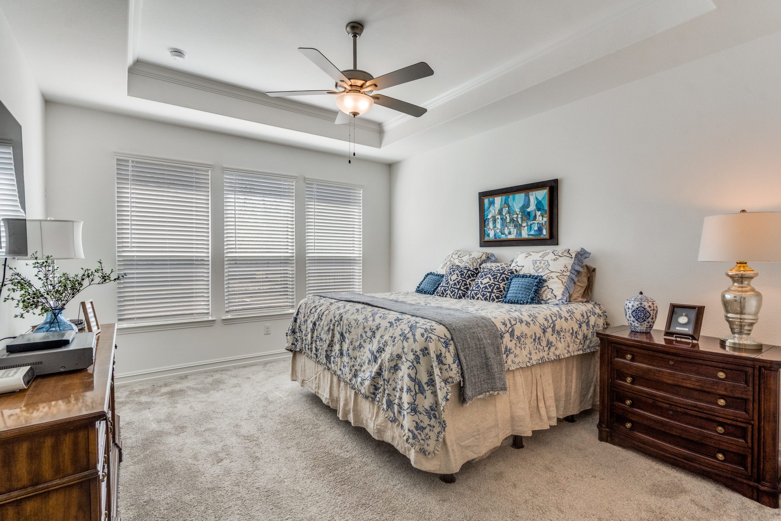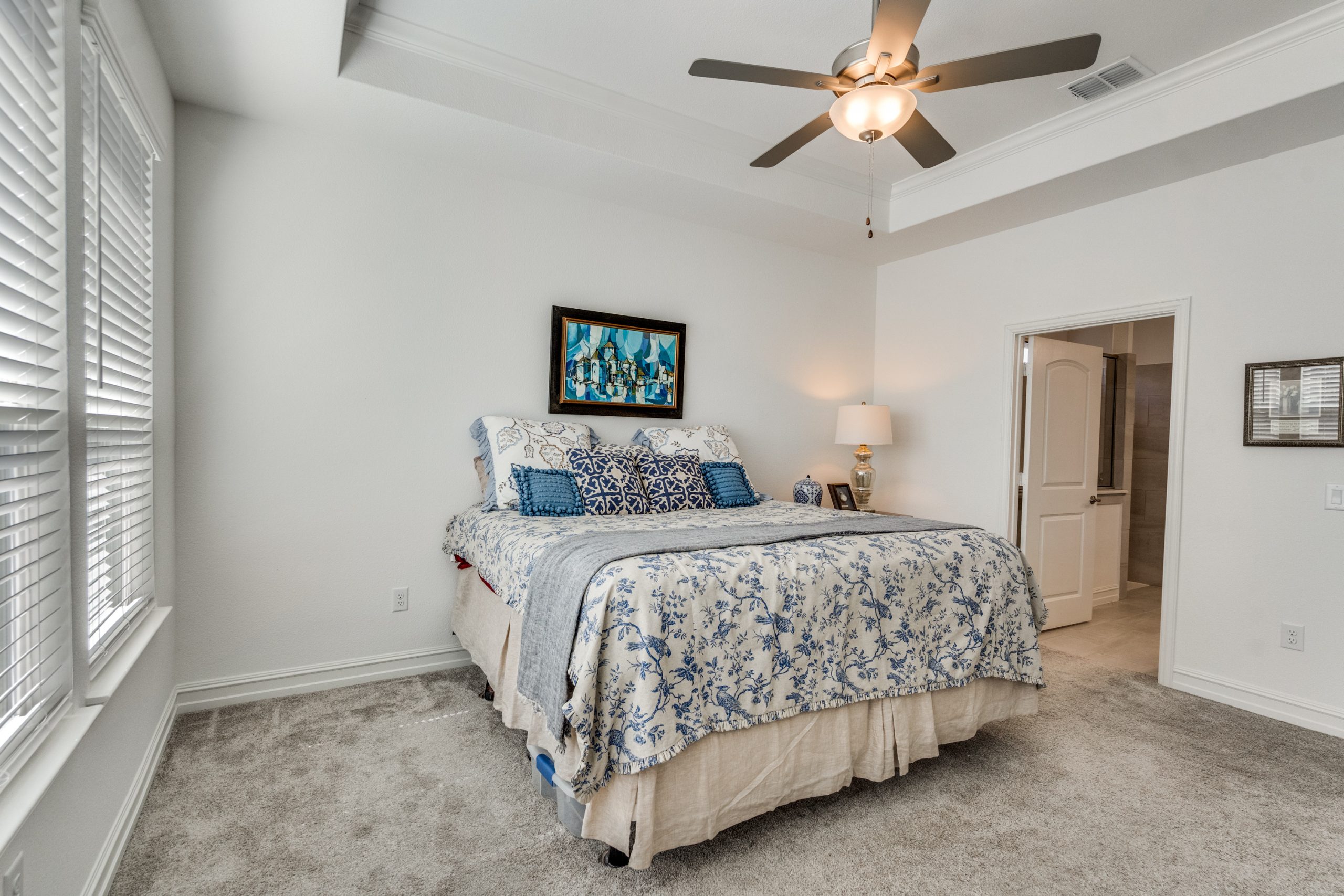 The primary suite is a true retreat with a tray ceiling and a spacious ensuite bath featuring a large vanity with dual sinks, a walk-in shower with bench seating, and a well-appointed walk-in closet.