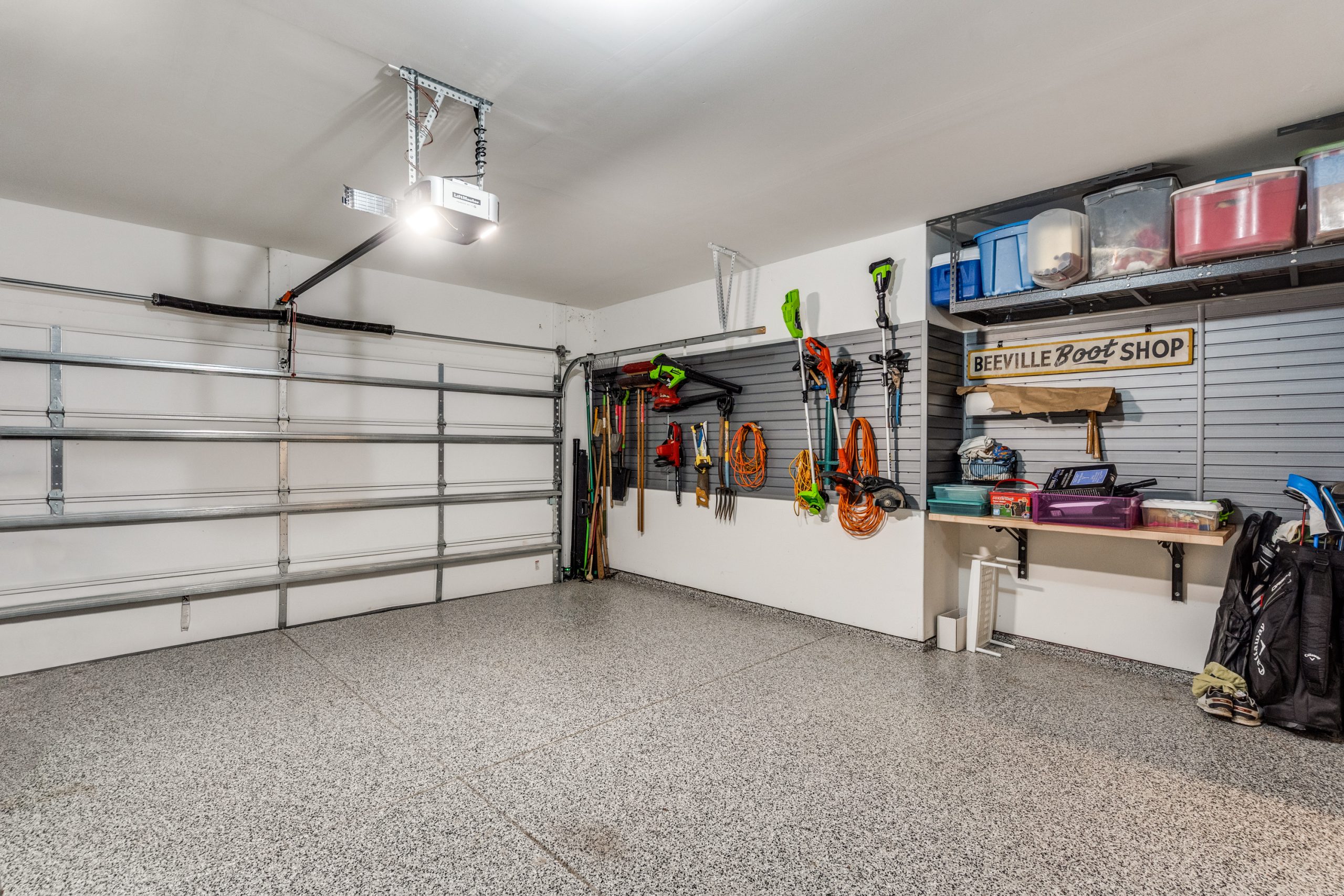 Additional highlights include a functional mudroom with builder-upgraded mud bench just off the garage entry, plus an extra storage closet that can easily serve as a second pantry. The garage itself has been thoughtfully upgraded with epoxy flooring and a custom wall storage system with mounted panels, shelving, and overhead storage—offering a clean, organized, and highly functional space.