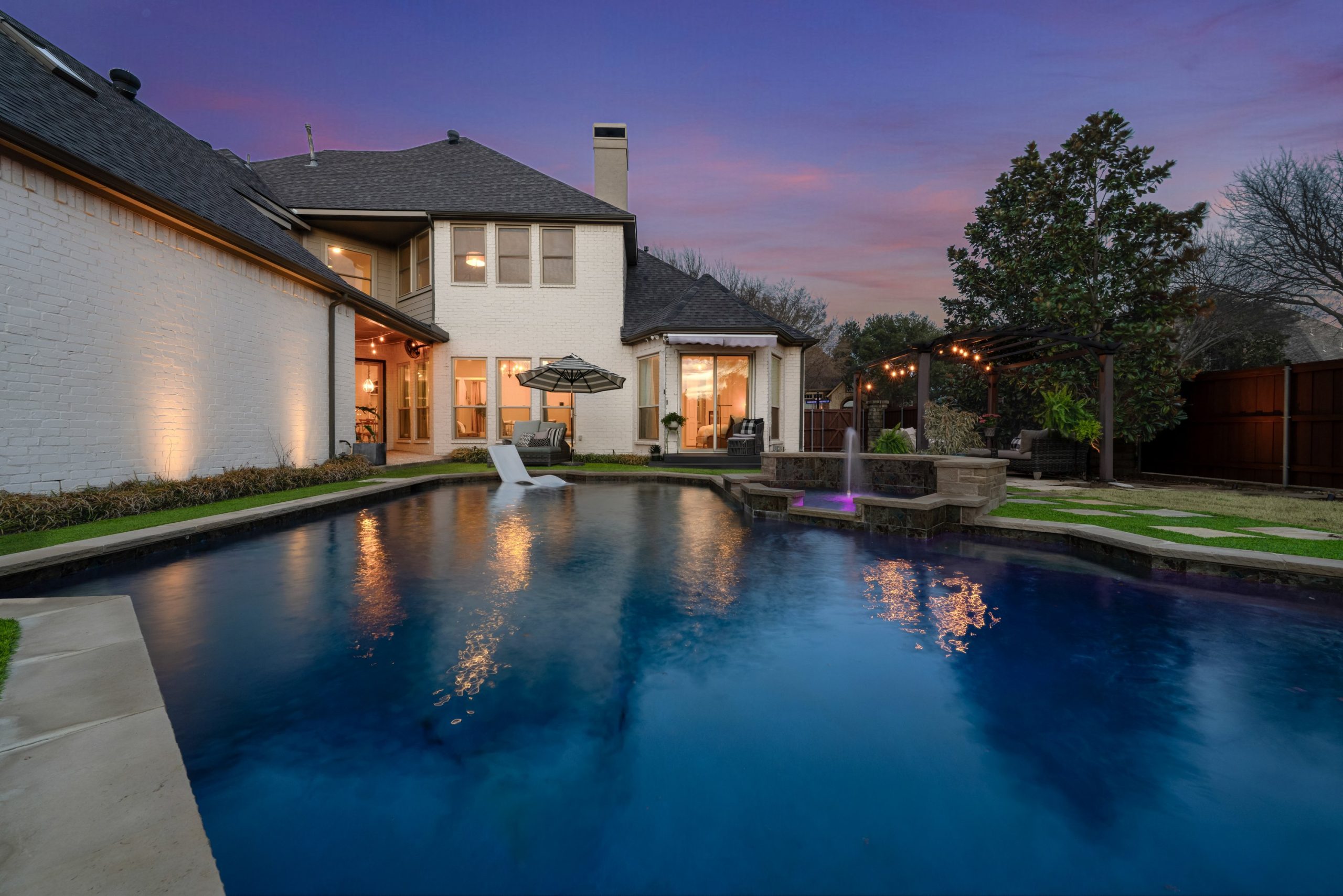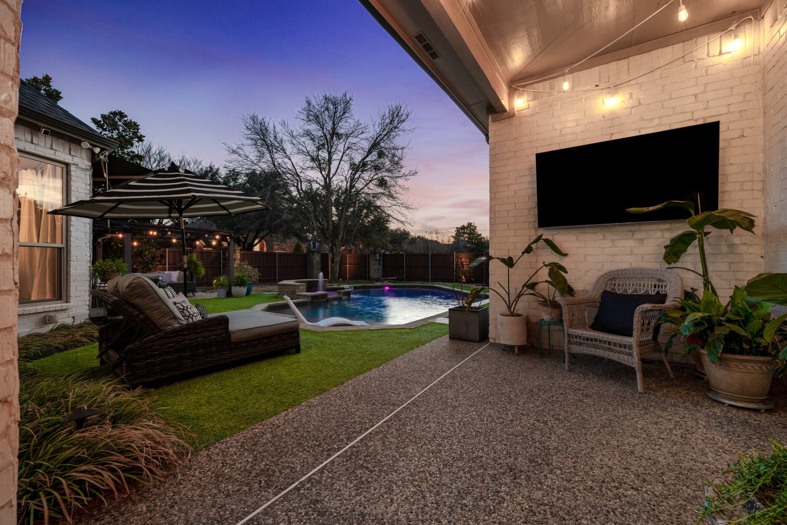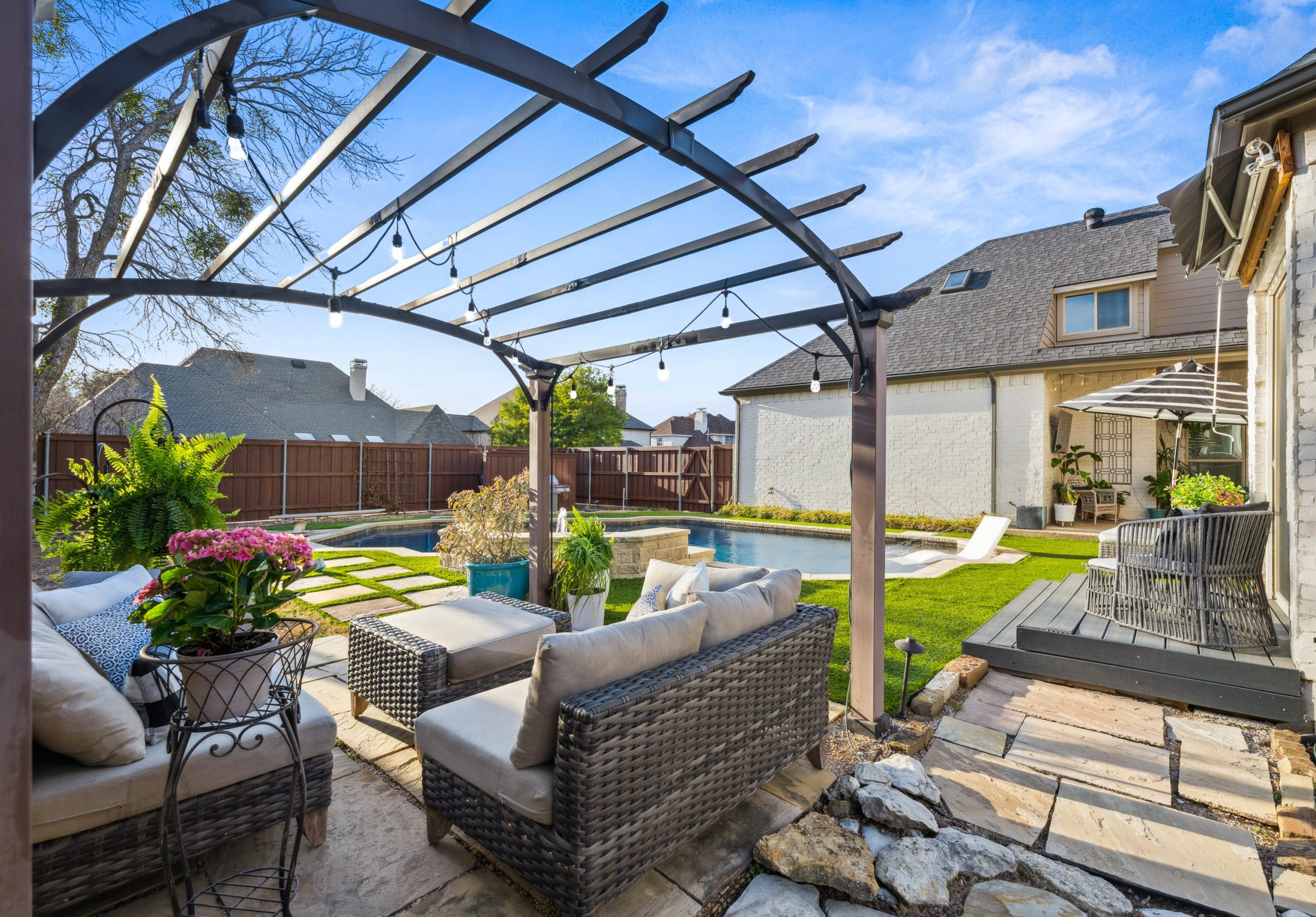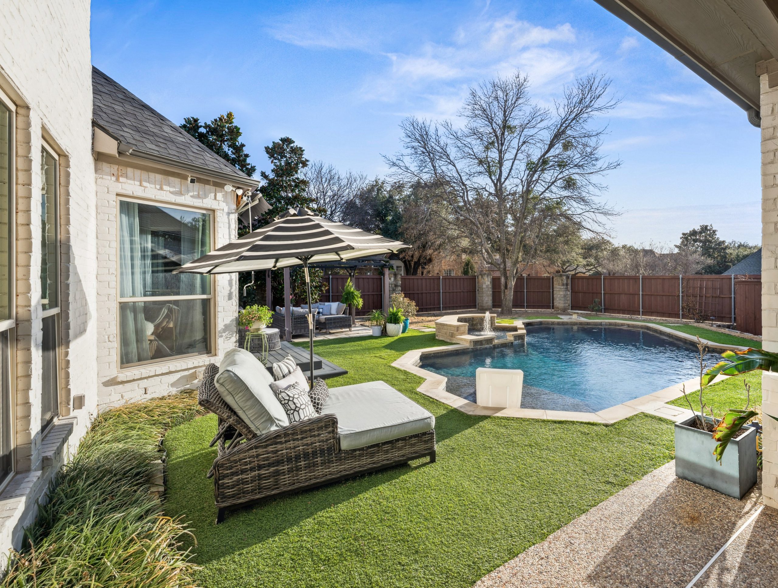 Step outside to your private backyard oasis. The heated pool features designer lighting, a tanning ledge, and smart system controls. Recent outdoor improvements include upgraded fencing, irrigation with smart sprinkler system, sod, French drains, and turf — providing both beauty and functionality year-round.