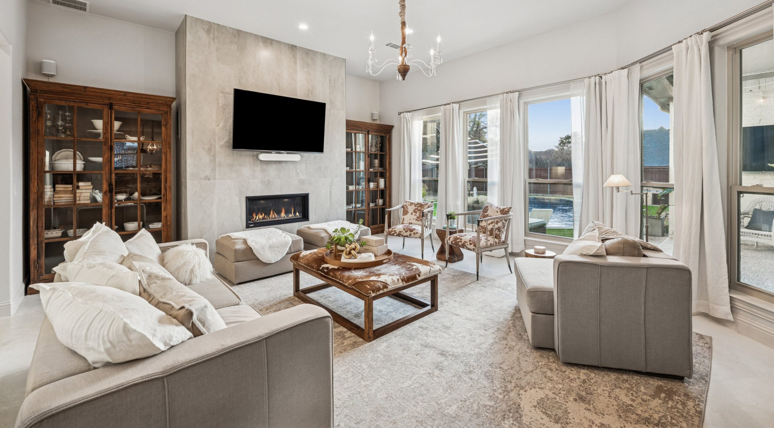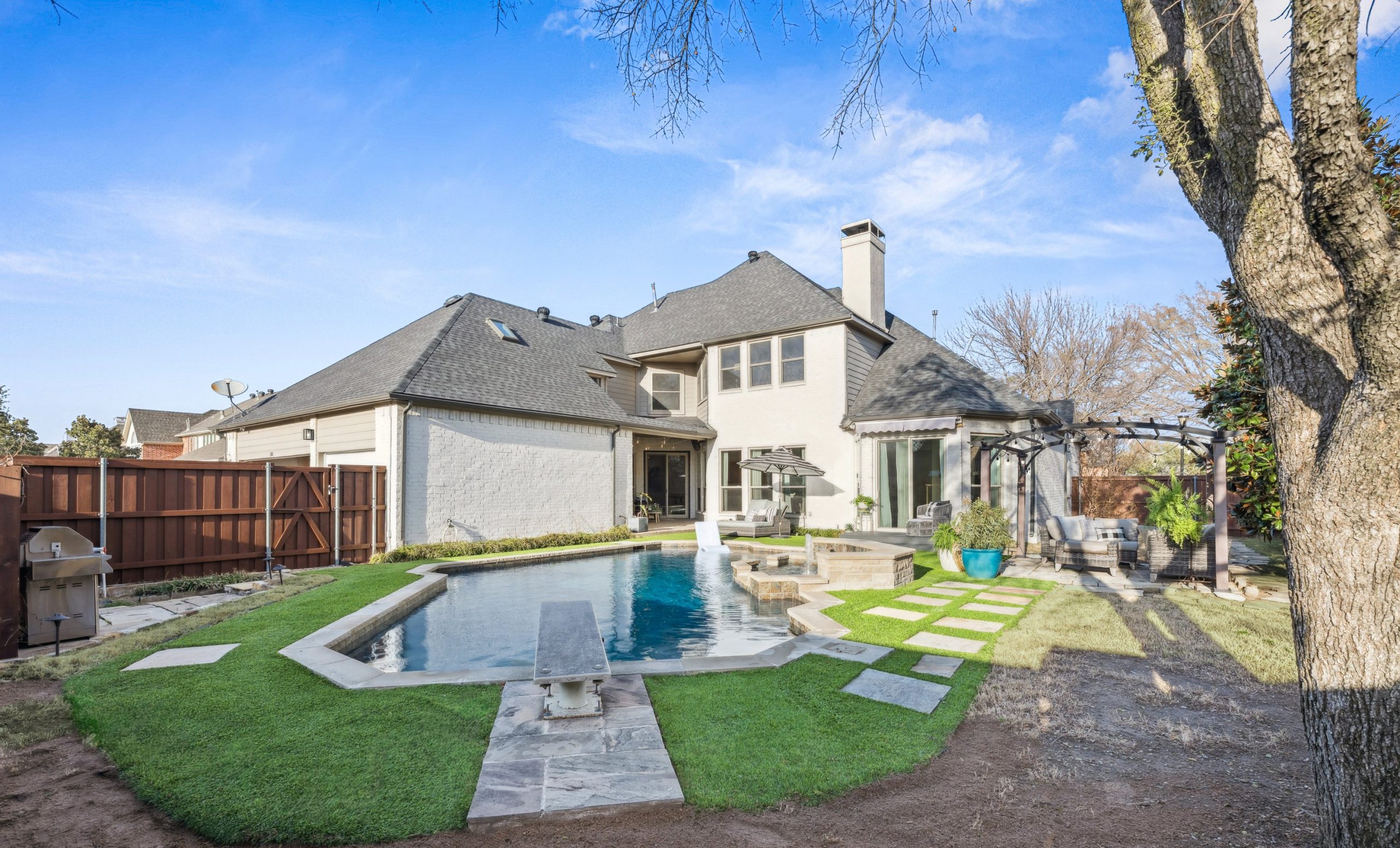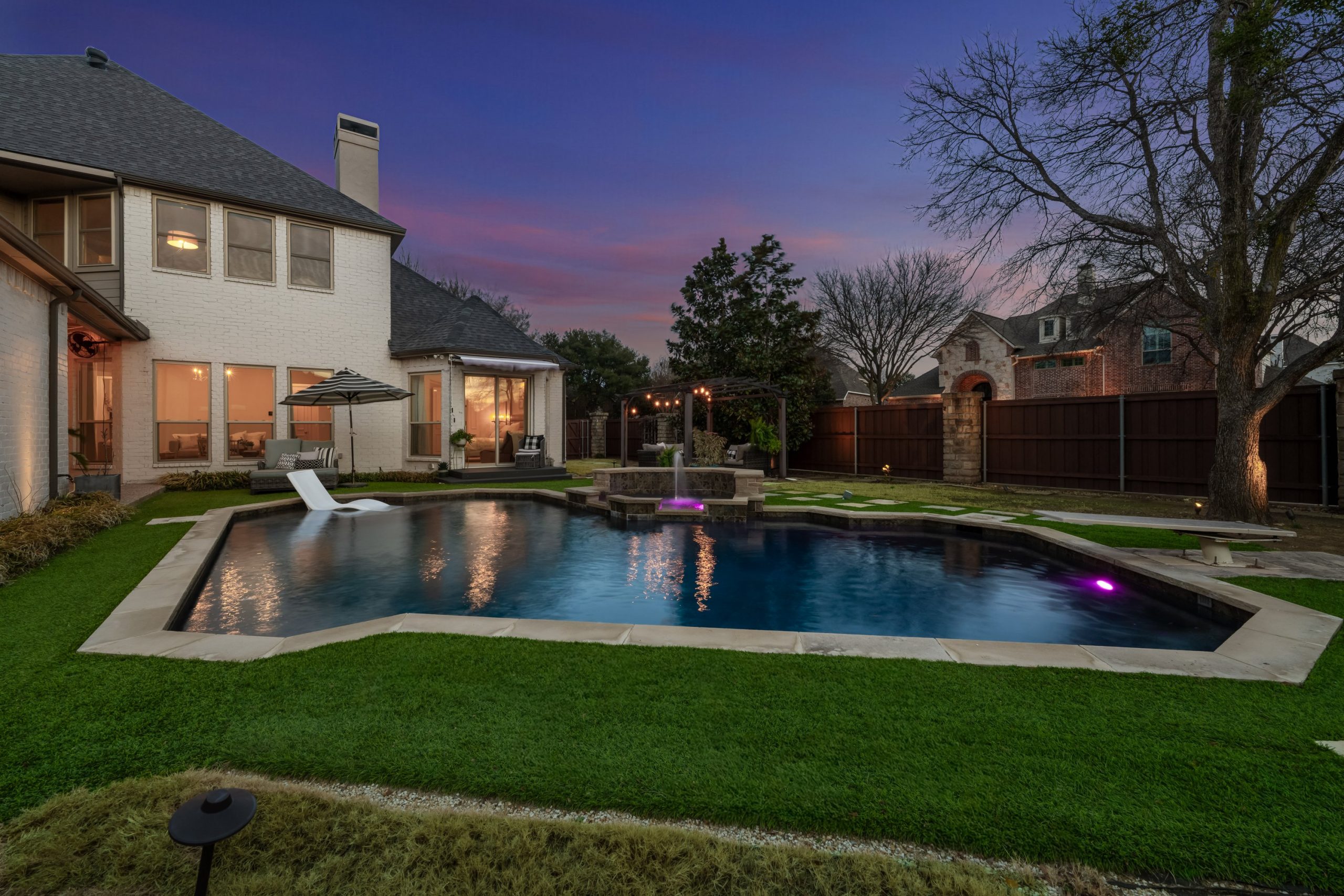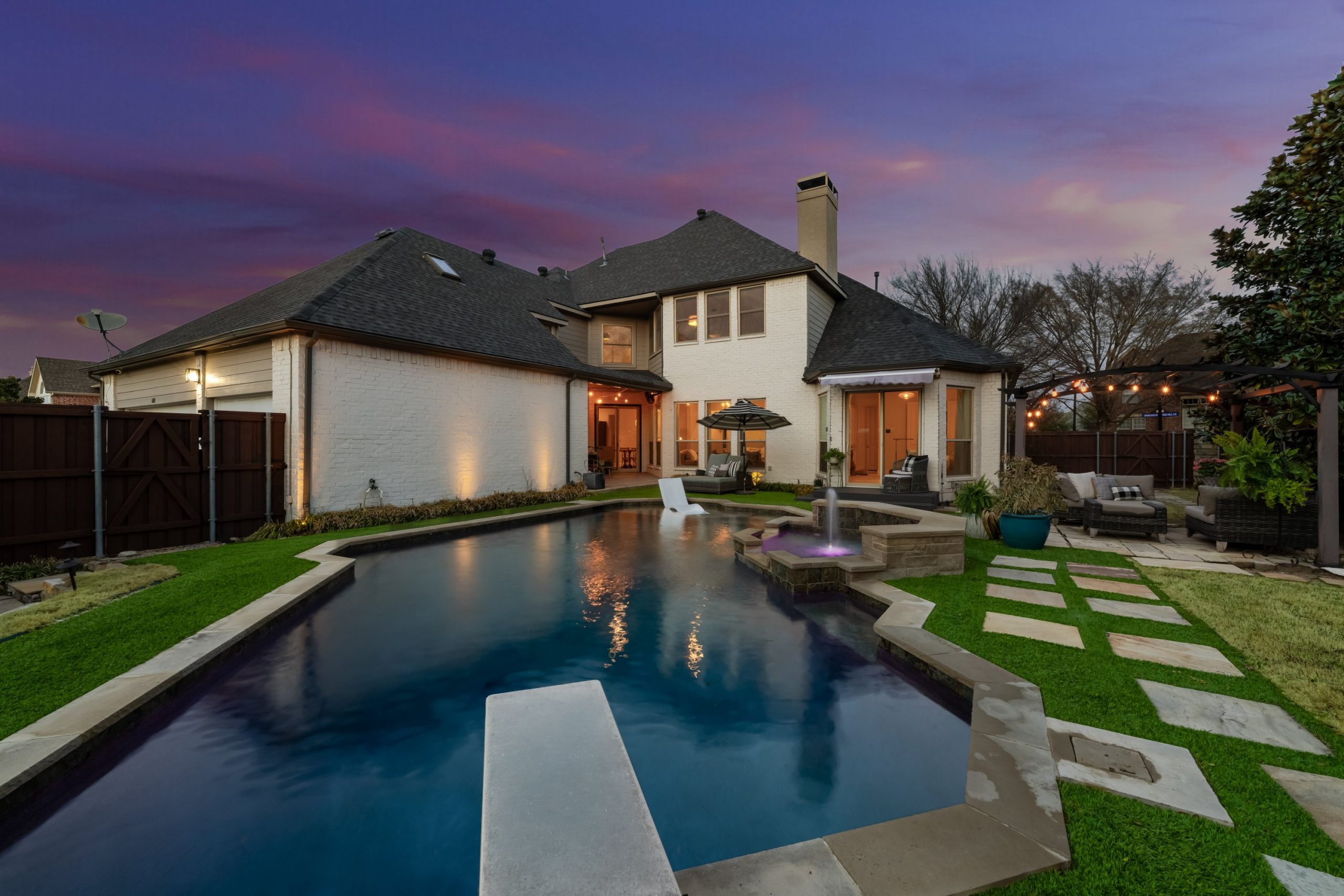 Step outside to your private backyard oasis. The heated pool features designer lighting, a tanning ledge, and smart system controls. Recent outdoor improvements include upgraded fencing, irrigation with smart sprinkler system, sod, French drains, and turf — providing both beauty and functionality year-round.