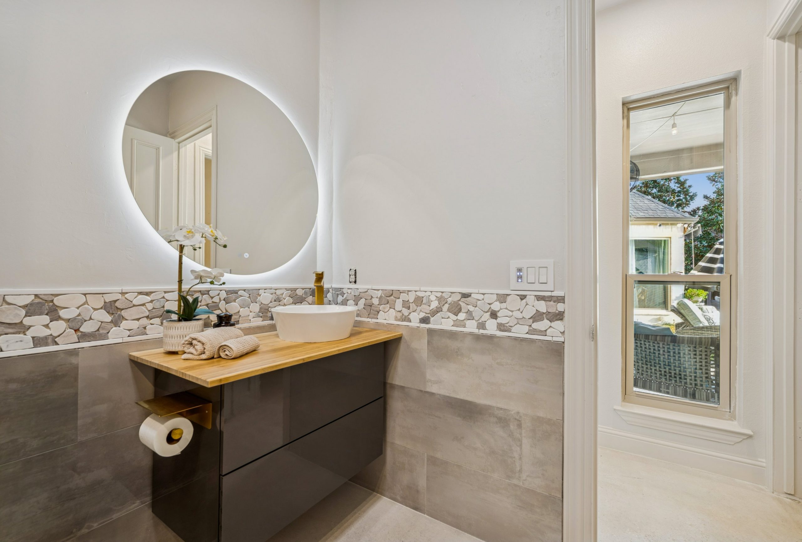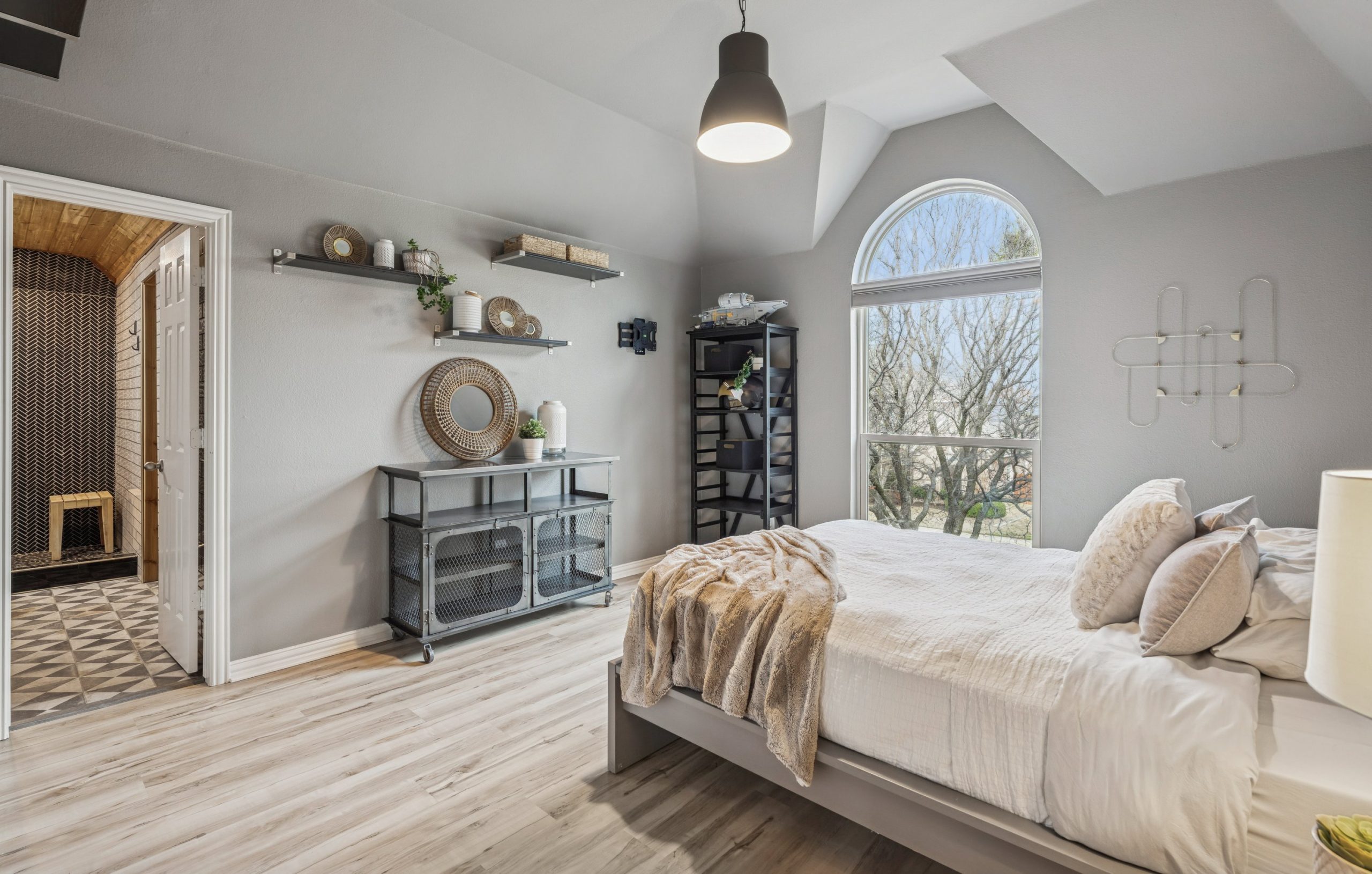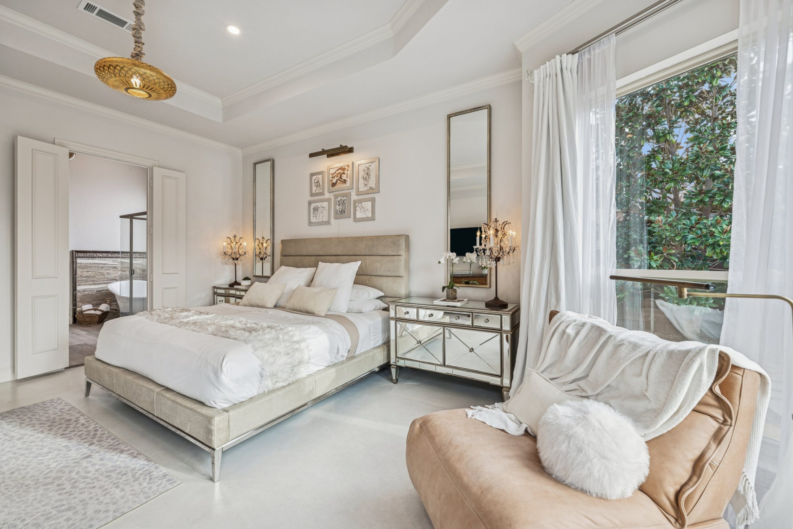 Every bathroom has been remodeled with meticulous attention to detail, featuring anti-fog mirrors and thermostatic shower systems for a true spa-like experience. The primary suite is a private retreat, offering a custom oversized shower, freestanding soaking tub, cedar-lined ceiling detail, anti-fog mirror, and programmable Hue lighting — creating a sanctuary of comfort and calm.