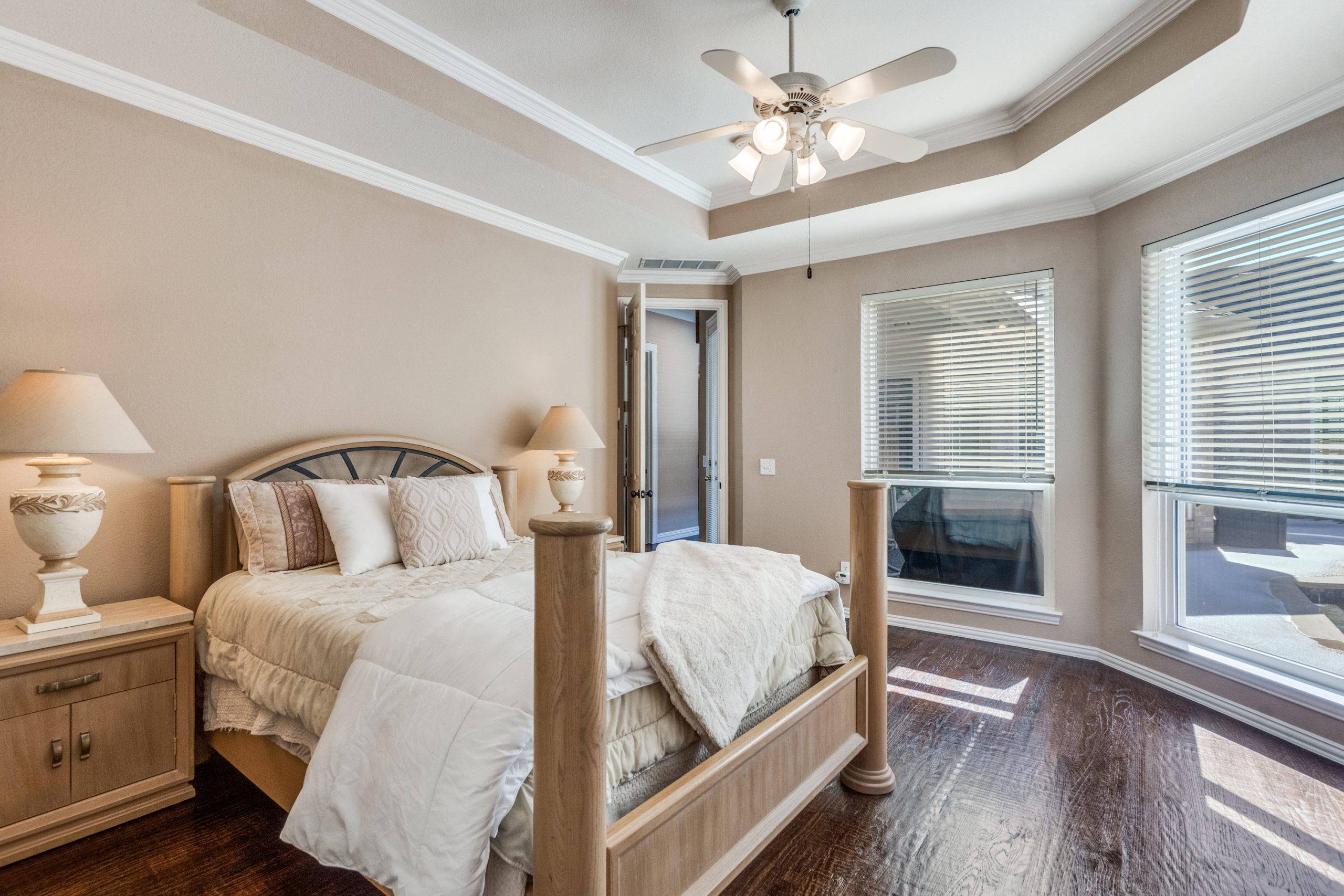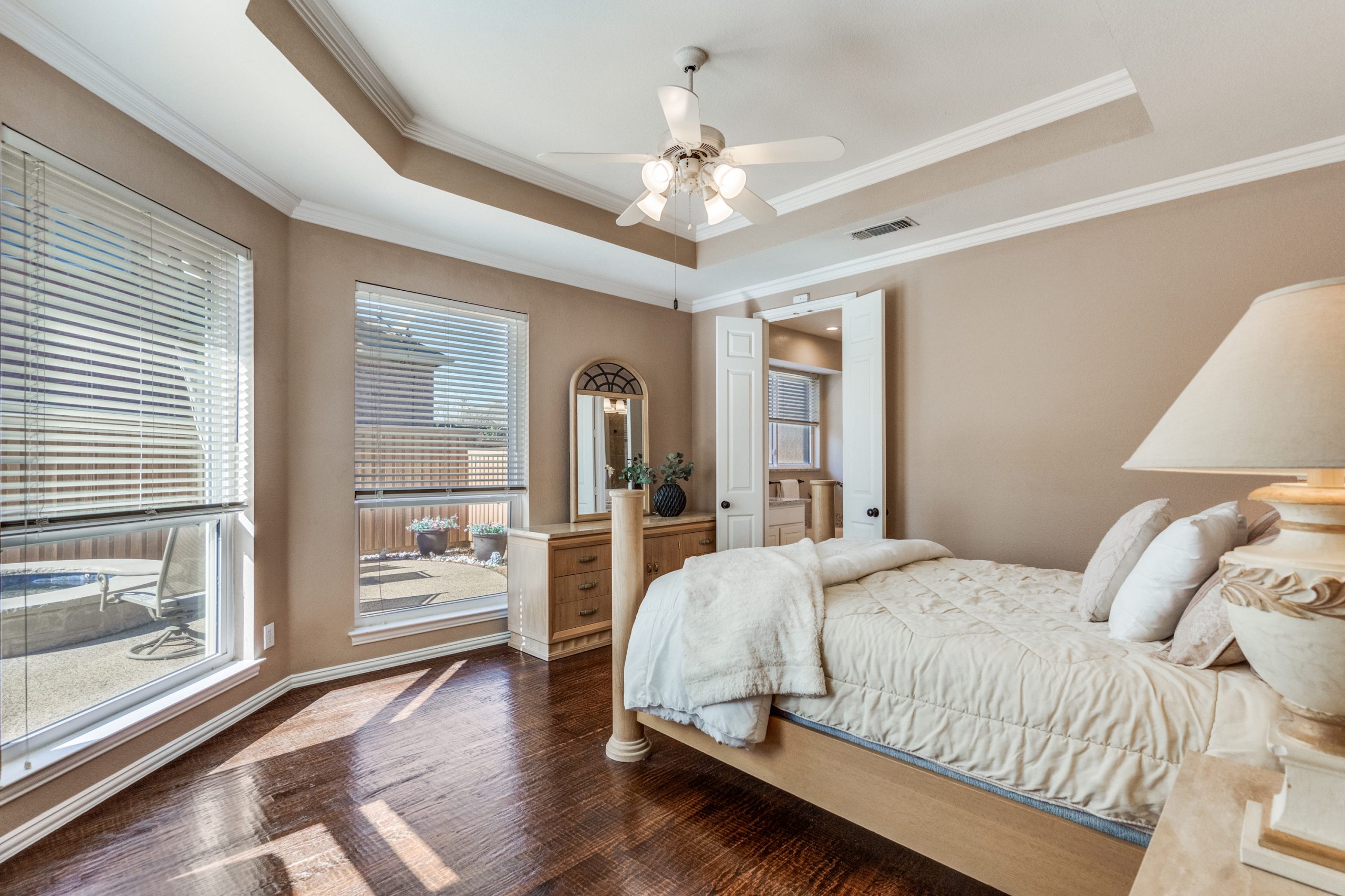 The light-filled primary suite includes an en-suite bathroom with jetted tub, dual vanities, a makeup table, glass-enclosed shower, and walk-in closet. Secondary bedrooms are well-sized and thoughtfully positioned.