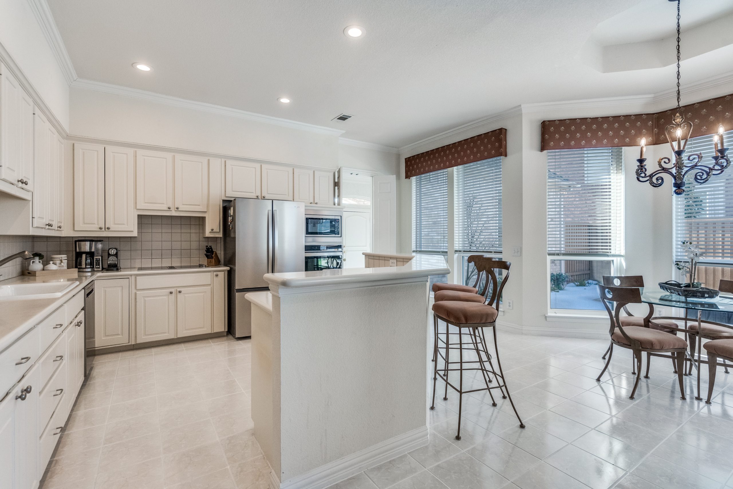 The kitchen opens to the living room and offers a large breakfast bar, stainless steel appliances, generous counter space, and easy flow to the breakfast nook. Hardwood flooring and tile extend throughout the home, complemented by classic plantation shutters. All windows were replaced adding comfort and efficiency.